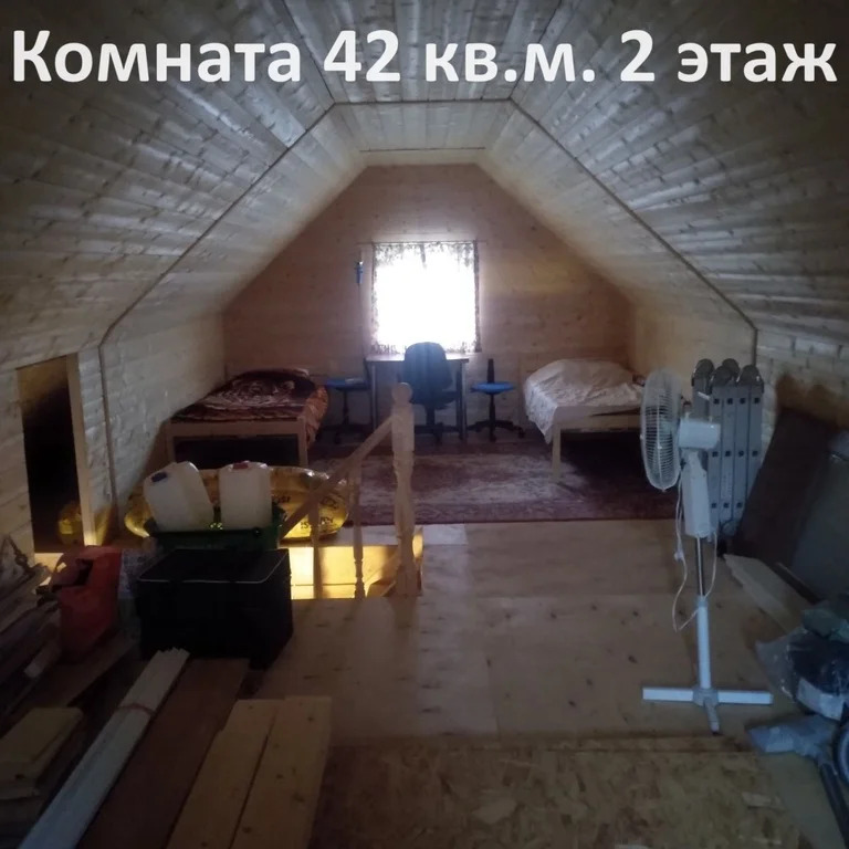 Второй этаж комната 42,1кв.м.(2 кровати, 2 матраца, карниз, штора, 2 стула, стройматериалы).